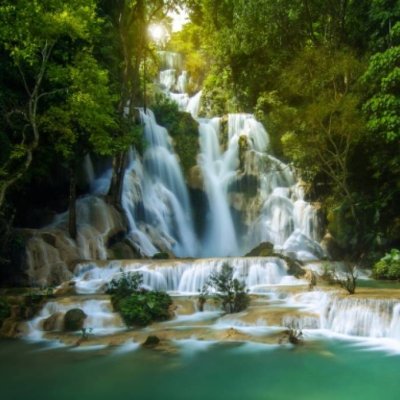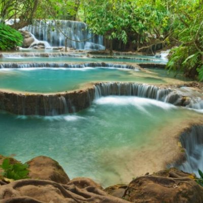 • pēcpusdienā džungļu ieskautais Kuang Si ūdenskritums, kurš vairākās kaskādēs gāžas pāri kaļķakmens klintīm, un upe izveidojusi tirkīza-zaļas krāsas baseiniņos