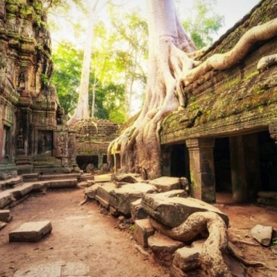 • ar saknēm apaugušā Ta Prohm tempļu drupas – Angkoras romantiskākais templis, kurš tā vien liekās iznācis no Indiana Džonsa filmas! Angkoras skati no Phnom Bakheng tempļa virsotnes