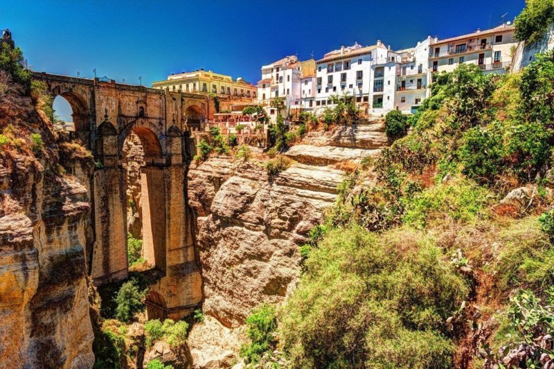 2. DIENA: Pa Balto ciematu ceļu - Setenil un RondaBrokastis viesnīcā. Šodien mēs iegrimsim romantisku ieliņu, gleznainu ciematu un pasakainu ainavu maģiskajā atmosfērā. Mūs gaida Andalūzijas Pueblos Blancos jeb Balto ciematu ceļš. Kā mazi, balti cukurgarudi, sabiruši Sierra Nevada kalnu nogāzēs, Spānijas Baltie ciemati lepojas ar mūžīgu valdzinājumu. Apmeklēsim divus no gleznainākajiem ciematiņiem, kas atrodas pārsteidzoši dramatiskās vietās, radot fantastiski sirreālus skatus. Setenil de las Bodegas ir viens no skaistākajiem un neparastākajiem ciematiem Andalūzijā. Būs grūti atrast unikālāku vietu par šo, kur pati daba ir tēlojusi arhitektu. Daudzas Sentenilas mājas ir burtiski iebūvētas klintī, zem milzīgām, dabiskām klinšu dzegām, radot unikālu ainavu, kurā baltās namu fasādes un pārsteidzošās šauro ieliņu ēnas nemanāmi saplūst ar akmeni. Cilvēki šeit burtiski dzīvo alu mājās un strādā veikalos un kafejnīcās zem klints, un tas ir patiesi iespaidīgi. Tas nav būvprojekts, bet gan perfekta pielāgošanās dabai. Tā nav filmēšanas vieta, bet gan reāla ikdienas dzīve. Setenila de las Bodegas šķiet nākusi no citiem laikiem un citas dimensijas, kur cilvēka radītais nepakļaujas ģeoloģijas un fizikas likumiem. Kalna gala virs ciema slejas mauru celtais pils cietoksnis, radot satriecošu vizuālo efektu. Ronda ir īsts brīnums - viena no iespaidīgākajām Andalūzijas pilsētām! Tā tiek dēvēta par vienu no skaistākajām vietām pasaulē un ir viena no vecākajām Spānijas pilsētām, kurā atrodas arī vecākā Spānijas vēršu cīņu arēna. Sapņu pilsēta, kā to savulaik nodēvējis dzejnieks Rainers Marija Rilke, kurš izteicies arī, ka nekas visā Spānijā nav tik pārsteidzošs kā šī mežonīgā pilsēta. Ronda ir izvietojusies uz augstas, gleznainas klints virs 120 metrus dziļās un 70 metrus platās dramatiskās El Tajo aizas. To ieskauj vīnogu dārzi, bet pa šauru aizu tās pakājē plūst mutuļojoša kalnu upīte. El Tajo aiza sadala pilsētu divās daļās, kuras savieno 98 m augstais slavenais romiešu tilts Puente Nuevo, kas šķietami izaug tieši no klintīm un no kura paveras elpu aizraujoši skati pār aizu un apkārtējiem kalniem. Rondas vēsturiskais centrs ar baltajām mājām, šaurajām ieliņām un senajiem laukumiem atspoguļo tās bagāto romiešu, mauru un spāņu kultūras mantojumu. Ronda apbur ar savu mierpilno atmosfēru, fantastiskajām ainavām un īpašo noskaņu, kas padara šo vietu par neaizmirstamu ceļojuma pieturu. Atgriešanās viesnīcā. Brīvs laiks atpūtai un vakariņām. Nakts viesnīcā Benalmadenā.