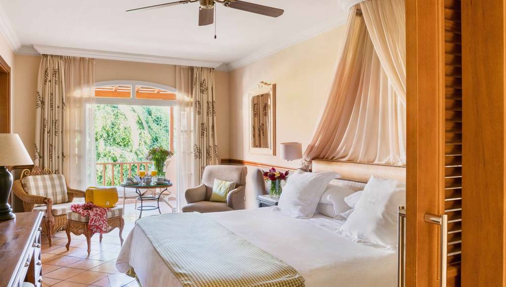 junior suite Casas Ducales (skats uz dārzu; guļamistaba un viesistaba (daži numuri ar durvīm starp istabām, bet daži ar arku), minibārs, vannasistaba, vannasistabas piederumi, pludmales soma, laikraksti, spilvenu un gultasveļas menu, maks. 2+2 cilv., 40 m2);
