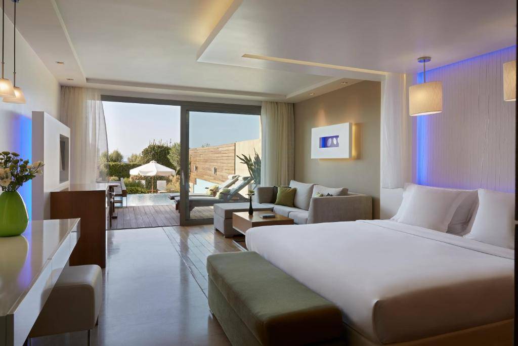 elite suite sea view with private pool & garden (skats uz jūru, vienistabas; divvietīgā gulta (2 vienvietīgās gultas pēc pieprasījuma), papildu gulta – izvelkamais dīvāns, terase – 13 m2 ar dārzu, privātais baseins ar hidromasāžu – 25 m2, maks. 3+1 cilv., 44 m2);