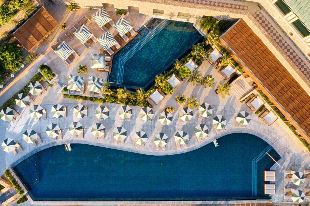 deluxe private pool sea view (skats uz jūru, guļamistaba, viesistabas zona, king size gulta, papildu gulta – saliekamā gulta, baseins ar jūras ūdeni (20 m2), maks. 3 cilv., iekštelpas 42 m2, ārtelpas 8 m2);