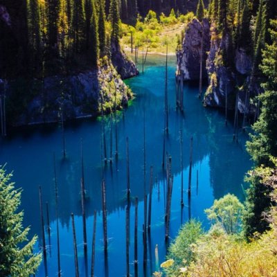 • Kaindy - sirreālākais ezers Centrālāzijā, kura krēmīgi zilganzaļajos ūdeņos paveras neticams skats – slīkstošais jeb nogrimušais mežs. Tas izveidojies 1911.gadā zemestrīces laikā, aizdambējot un pārpludinot mežiem klātu ieleju. Dīvaini, bet zem ūdens mežs joprojām ir dzīvs un zaļš, bet virs ūdens paveras tikai nokaltuši koku stumbri