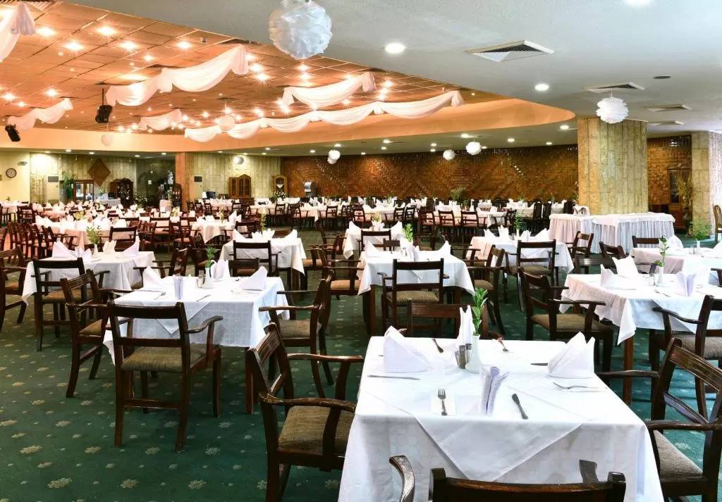 рестораны: 2 (основной ресторан (на 350 чел.); панорамный ресторан «Синее небо» (на 120 чел.) на 17 этаже)