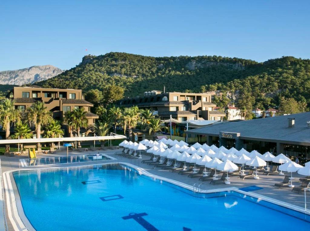 в 65 км от аэропорта г. Анталья, в 50 км от г. Анталии, в 7 км от центра Кемера, в посёлке Кириш, на берегу моря.