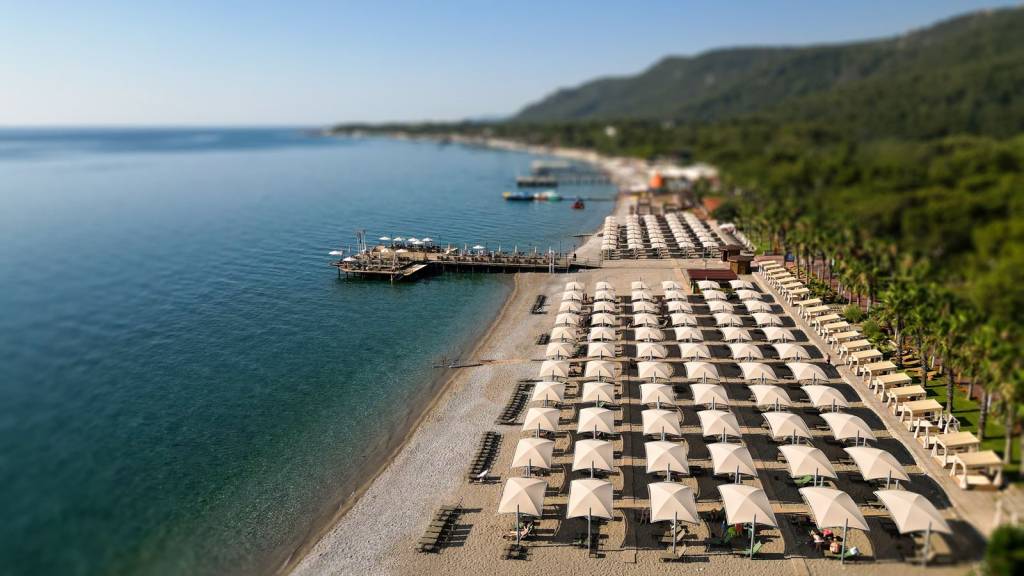 в 41 км от аэропорта г. Анталья, в 15 км от г. Кемер, в поселке Бельдиби, на берегу моря.