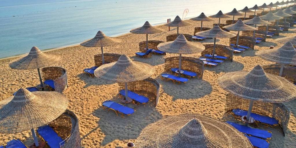 viesnīcas, gara, smilšaina, lēzena piekļuve jūrai, koraļļu rifs, ieteicams valkāt aizsargapavus, tieši pie viesnīcas, bezmaksas saulessargi, zviļņi un dvieļi; uz bāru attiecas formula "viss iekļauts” (All Inclusive).