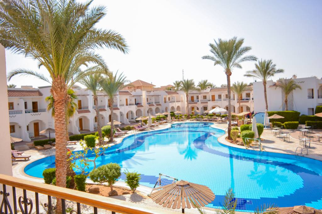 в 20 км от аэропорта Шарм-эль-Шейха, в 8 км от бухты Naama Bay, в 3 км от Старого города, в районе Hadaba, на втрой линии.