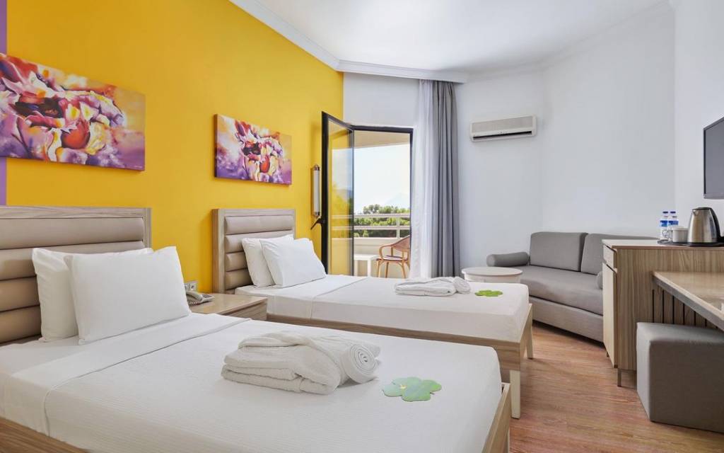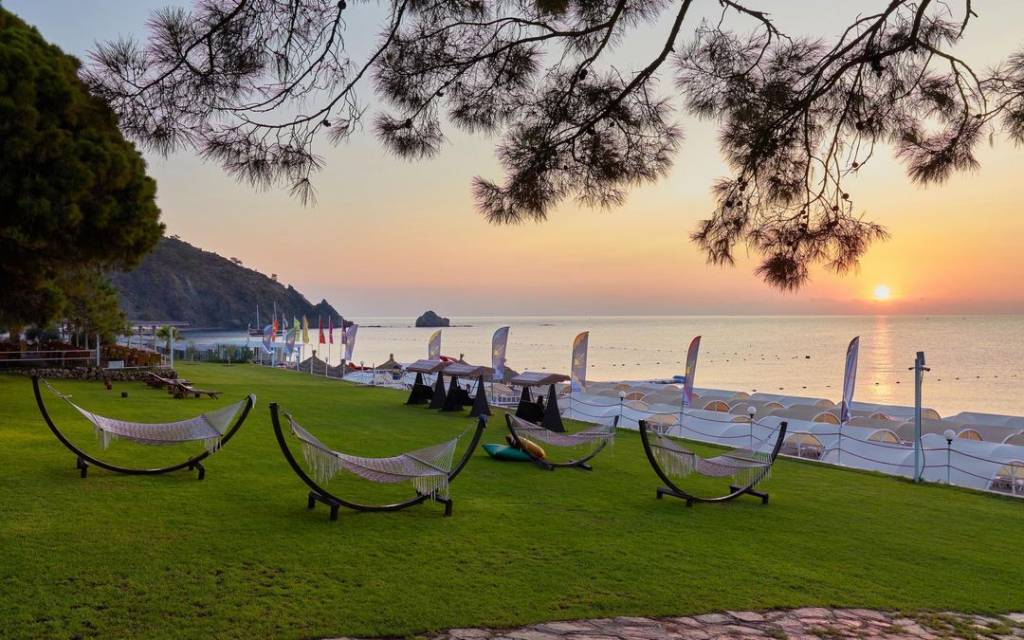 в 75 км от аэропорта г. Анталья, в 18 км от г. Кемер, в поселке Текирова, на берегу моря.