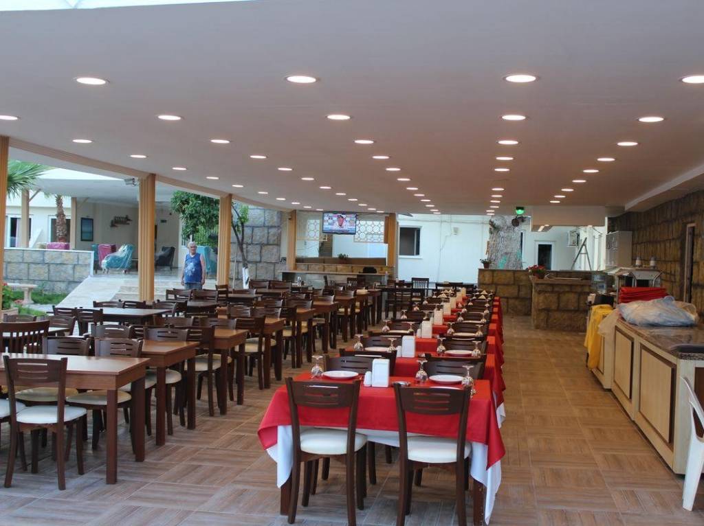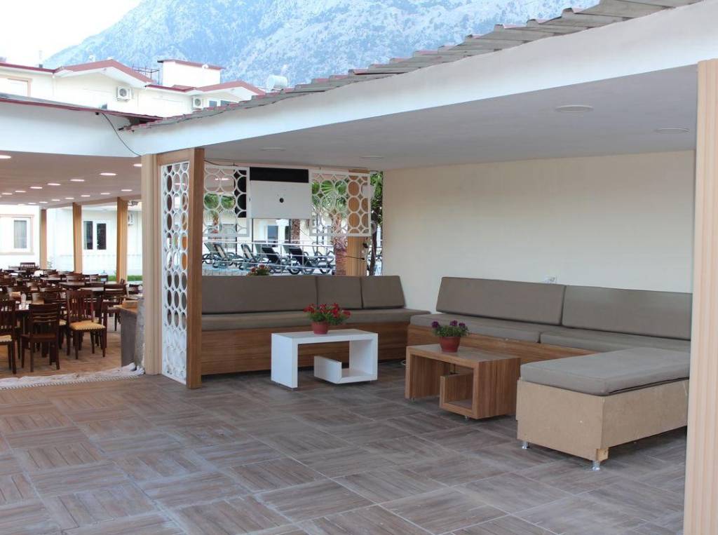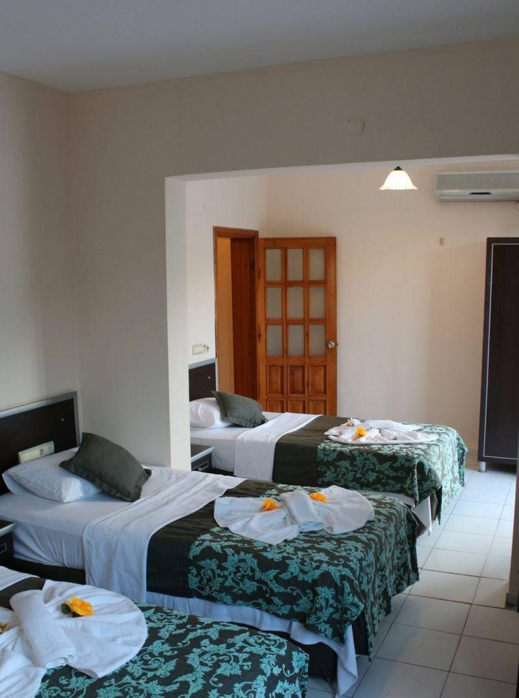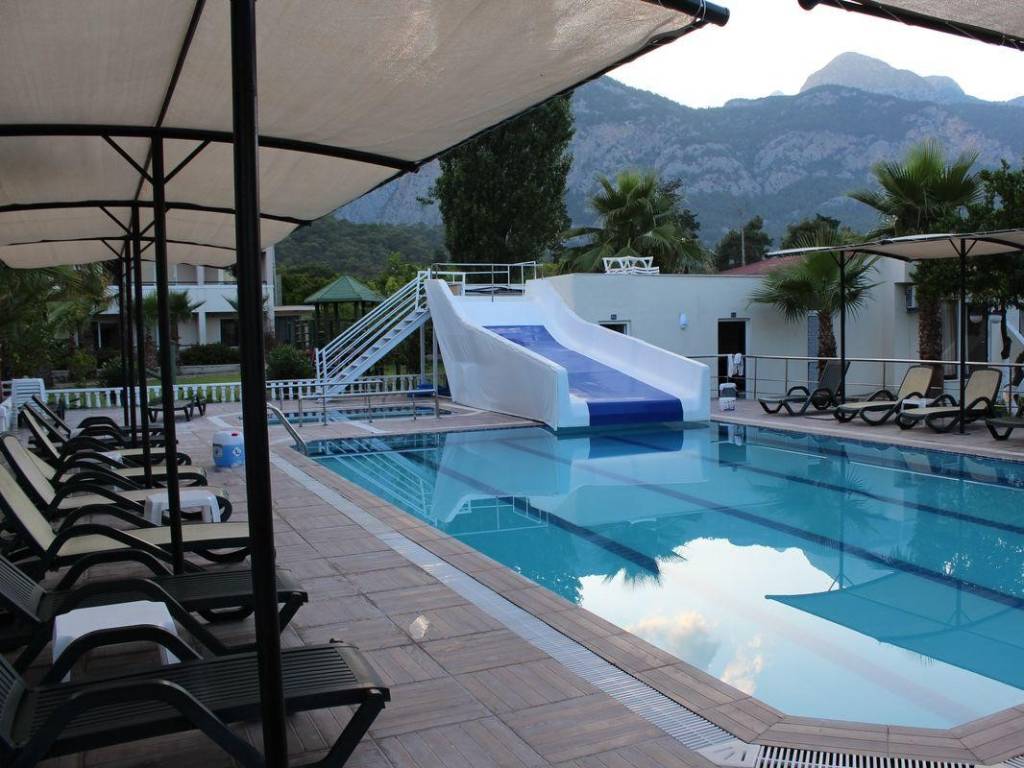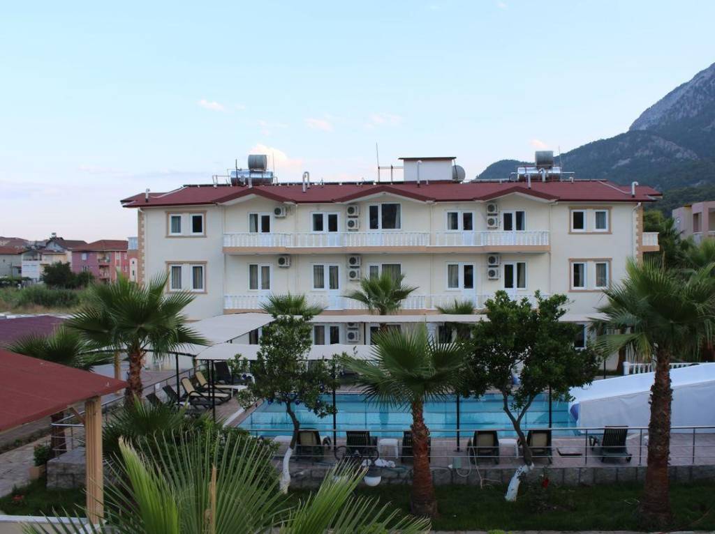 в 45 км от аэропорта г. Анталья, в 15 км от г. Кемер, в поселке Бельдиби, в 400 м через дорогу от пляжа (транспорт не предоставляется).