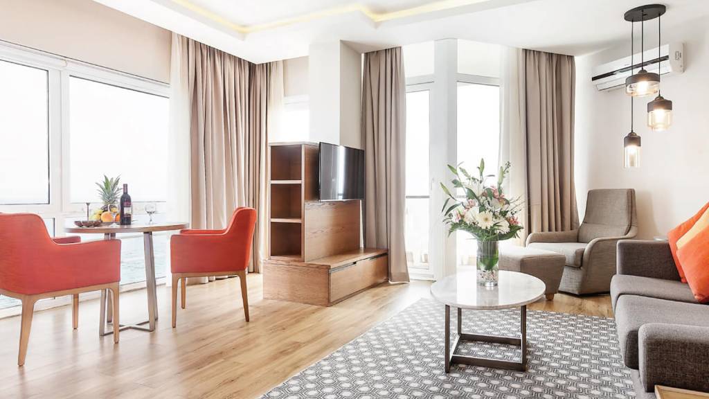 Standard Side Sea View Park Building: двухместный (макс. 2+1 ребенок, с 1 дополнительной кроватью – раскладной), около 24 м2, санузел (душ, туалет, фен), кондиционер, мини-бар, телевизор, WiFi, телефон, балкон , парковое здание, боковой вид на море.